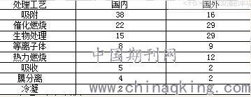 印刷有機廢氣治理應用zui廣泛的技術包括吸附法、熱力氧化、光催化氧化、生物法等[2],單一的治理技術存在不同的缺陷,比如:活性炭吸附更換周期短、不耐濕度和高溫(低于120 ℃脫附),產生大量危廢;蓄熱式熱力氧化(RTO)設備投資成本高,運行能耗大,無需輔助燃料廢氣濃度>2 000mg/m3;光催化對濃度大于0.03%的有機廢氣無法實現穩定達標排放。為降低治理成本,提高適用范圍,末端治理重點研究印刷有機廢氣治理技術集成與創新。國內外發展出吸附濃縮-催化燃燒、吸脫附-冷凝回收等有機廢氣治理集成工藝。同時,國外對微生物法處理印刷廢氣情有獨鐘,生物處理技術在印刷廢氣治理技術中的比例達到了29%。相關研究涉及了生物過濾處理對含甲苯、二甲苯、乙酸乙酯等有機廢氣的去除效果、影響因素及動力學模型。國內也對這項技術進行了研究,研究主要側重于微生物馴化,各類因素如:VOCs 組成、進氣濃度和速率、填料性質、填料溫濕度、營養物質、pH 值、微生物和氧氣、表面活性劑等對有機廢氣凈化處理效果的影響。總得來說,有機廢氣凈化處理技術可以分成:回收法和破壞法兩大類[3]。不同有機廢氣處理技術在國內外市場占有率見表1。