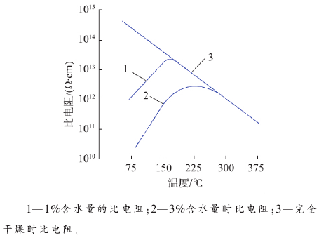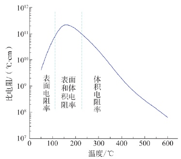 粉塵比電阻是兩種獨立的導電機理的綜合,即體積比電阻和表面比電阻。當粉塵溫度>225℃時,體積傳導機制起主要作用,溫度上升、粉塵比電阻減小;當溫度<150℃時,表面傳導機制主要作用,溫度上升、粉塵比電阻增大;當溫度為150~225℃時,粉塵比電阻會出現峰值,達到1012Ω·cm等級,見圖4。